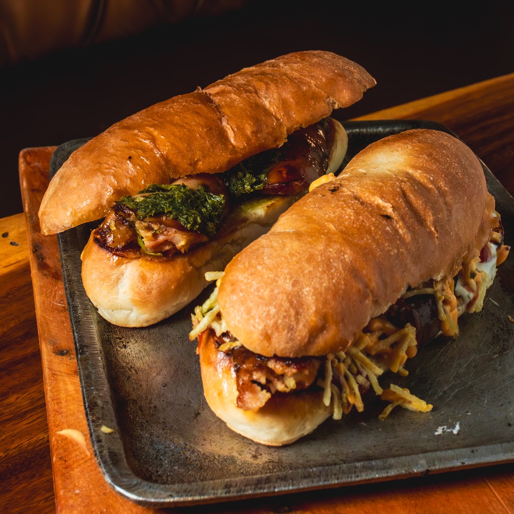 Clásico choripán argentino con chorizo argentino, pan baguette, queso mozarella y chimichurri argentino.